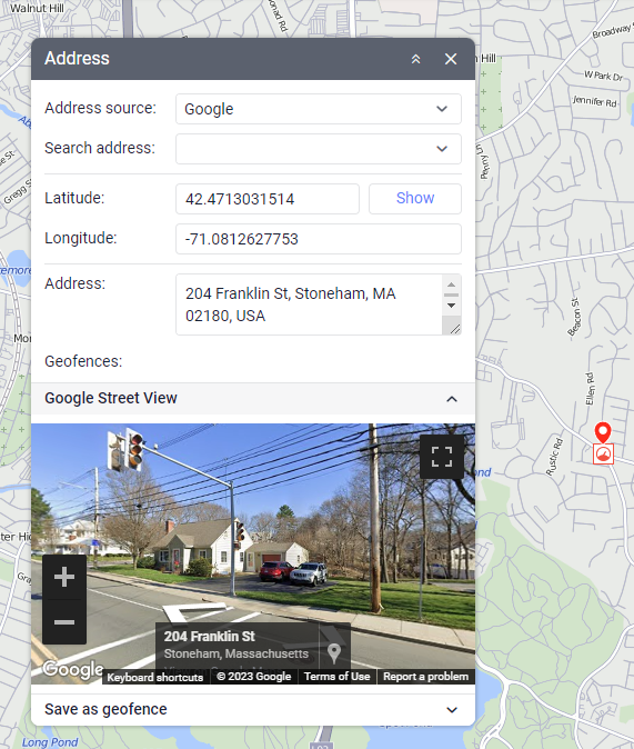 Les images panoramiques du territoire peuvent être affichées en cliquant sur les marqueurs des stationnements et des arrêts. Pour cela, les cartes avec des panoramas (par exemple, Google Street View) doivent être sélectionnées dans les paramètres de l’utilisateur. S’il existe des images du territoire avec les coordonnées du marqueur, le curseur passe de la flèche à la main lorsqu’il est pointé sur le marqueur. Cliquez sur le marqueur pour ouvrir un instantané panoramique dans la fenêtre de l’outil Adresse. Double-cliquez sur un autre marqueur de ce type pour mettre à jour les informations.