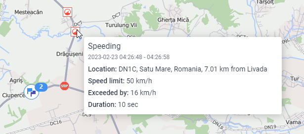 | Excès de vitesse | Heure de début (heure de réception du premier message avec une valeur de vitesse supérieure à la valeur autorisée) et heure de fin, durée, localisation, limitation de vitesse telle que spécifiée dans les propriétés de l'unité, valeur de dépassement de la vitesse. |