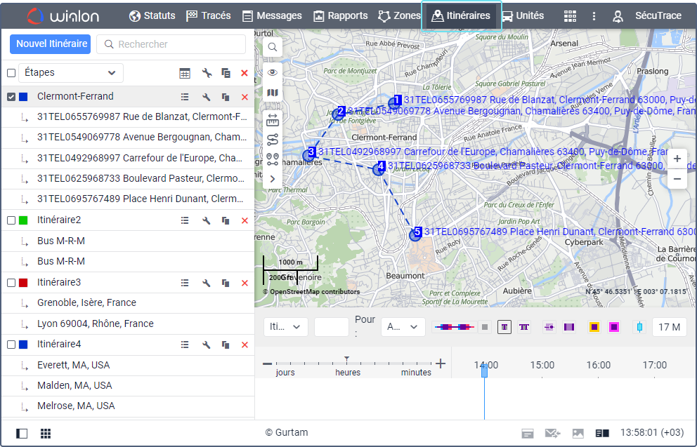 Sur cet onglet, vous pouvez ccréer des itinéraires pour les unités, surveiller l’exécution des voyages, vérifier leur statut, etc. Les itinéraires consistent en des étapes que les unités doivent visiter dans une séquence déterminée ou arbitraire selon un horaire spécifié. Il y a une recherche dynamique qui fonctionne par nom de l’itinéraire sur l’onglet.