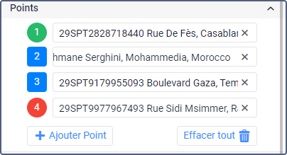 Dans cette section, vous pouvez ajouter les points (étapes) d’itinéraire et les opérer. Pour planifier un itinéraire, vous devez spécifier les adresses de deux points obligatoires : le point de départ et le point d’arrivée. Vous pouvez également ajouter n’importe quel nombre de points de passage à l’itinéraire.
