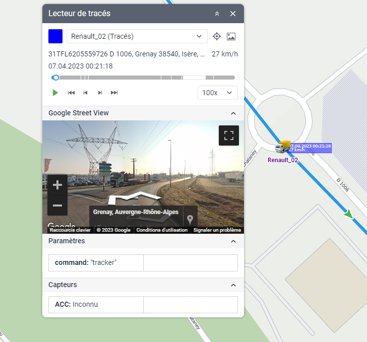 Pendant la lecture, sous le nom de l’unité, vous pouvez voir l’adresse et la vitesse de chaque message, et au-dessus de la ligne temporelle, la date et l’heure sont affichées. De plus, si vous avez des clés Google ou Regional, vous pouvez suivre le mouvement des unités à l’aide des vues panoramiques des rues. Pour ce faire, développez les sections Google Street View ou Regional Panorama ci-dessous.