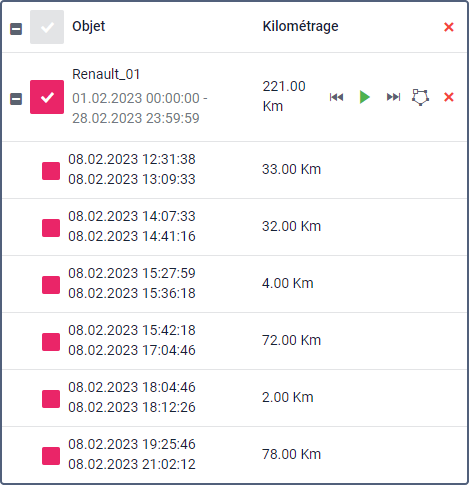 Vous pouvez trier les tracés de la liste par nom d’unité ou par kilométrage. Pour ce faire, cliquez respectivement sur l’en-tête Objet ou Kilométrage. Cliquez à nouveau sur l’en-tête pour inverser l’ordre de tri. Pour effectuer des actions avec des tracés, les icônes suivantes sont disponibles :