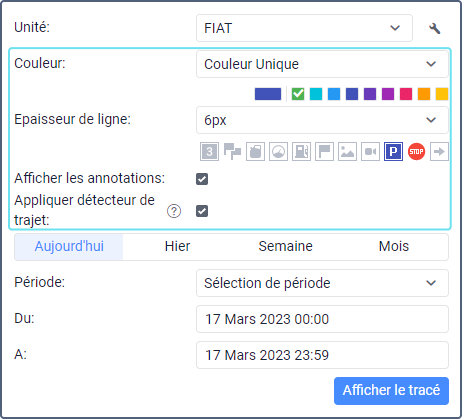 Un tracé peut être représenté par une ligne continue ou simplement par des points à partir desquels l’unité a envoyé des messages au serveur. Pour la première option, vous devez spécifier l’épaisseur de ligne en pixels de 1 à 15 ; pour la deuxième option, sélectionnez Points seulement.
