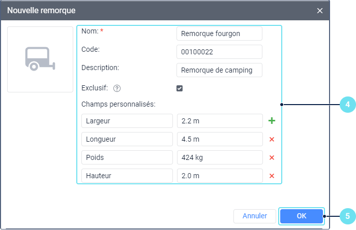 Specify the properties of the trailer: name, automatic assignment code, description. If necessary, enable the Exclusif option, add custom fields, and upload a PNG, JPG, GIF or SVG image. The properties of a trailer are similar to those of a driver.