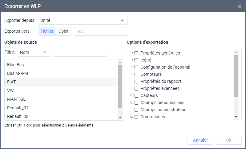 Pour exporter les propriétés de l’unité, sélectionnez Exporter en WLP dans le menu d’utilisateur et dans la fenêtre qui s’ouvre, spécifiez Unité comme type d’élément. Voir les instructions détaillées ici.