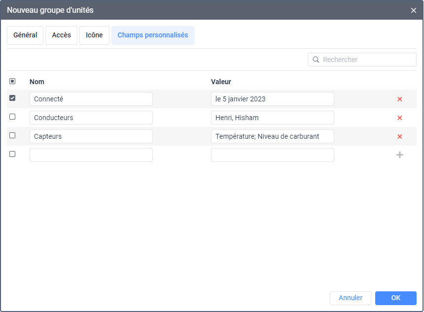 Sur cet onglet, vous pouvez créer des champs personnalisés avec des informations supplémentaires sur le groupe ou les unités y ajoutées.
