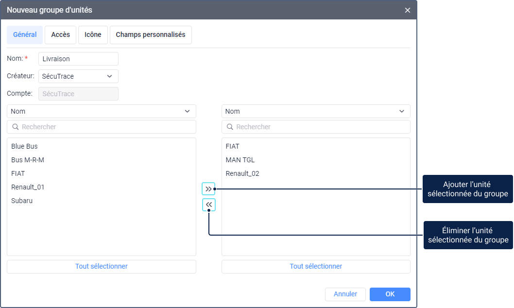 Unités | La liste de gauche montre toutes les unités disponibles, la liste de droite montre celles qui ont déjà été ajoutées au groupe. Pour modifier le nombre d’unités ajoutées au groupe, vous devez disposer du droit d’accès Ajouter ou éliminer unités du groupe. Pour rechercher rapidement des unités par nom, utilisez le filtre dynamique. Pour rechercher d’autres propriétés de l’unité (par exemple, ID unique, type d’appareil, etc.), sélectionnez l’option correspondante dans la liste déroulante au-dessus de la recherche. Pour ajouter une unité au groupe, déplacez l’unité de la liste de gauche vers celle de droite ; pour supprimer, faites-le à l’envers. Pour déplacer des unités, utilisez les icônes / ou double-cliquez sur les unités sélectionnées. Pour sélectionner plusieurs unités, maintenez la touche Ctrl et sélectionnez les unités nécessaires. Pour sélectionner toutes les unités de la liste à la fois, cliquez sur Tout sélectionner. En outre, des unités peuvent être ajoutées ou supprimées des groupes automatiquement. Pour ce faire, créez une notification avec la méthode d’action Ajouter ou supprimer des unités des groupes. |