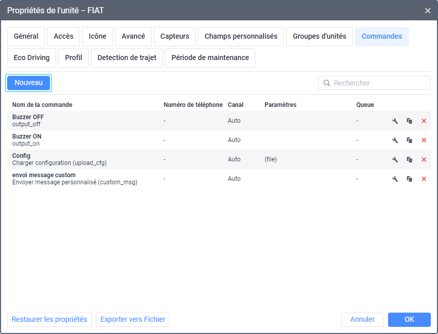 Pour créer une commande, cliquez sur Nouveau, spécifiez ses propriétés et cliquez sur OK.