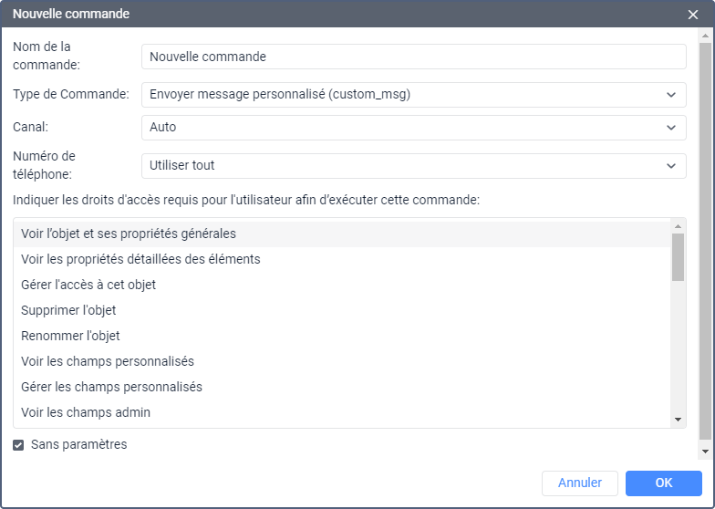 | Paramètres | Certaines commandes nécessitent des paramètres supplémentaires. Il peut s’agir, par exemple, d’un numéro d’entrée ou de sortie, d’un intervalle de rapport en ligne, etc. Pour spécifier des paramètres, désactivez l’option Sans paramètres et remplissez les champs obligatoires. Si les paramètres ne sont pas spécifiés lors de la création de la commande, ils doivent être spécifiés lors de son envoi. Les paramètres spécifiés lors de la création de la commande ne peuvent pas être modifiés lors de l’envoi de la commande. |