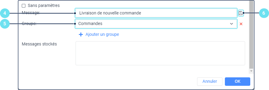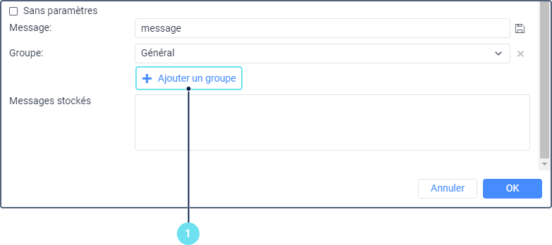 Lors de la configuration de la commande Envoyer un message personnalisé, vous pouvez créer des groupes pour y ajouter des messages. Cela vous permet de trouver rapidement le message recherché lors de l’envoi de la commande.