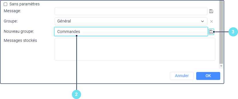Si l’option Sans paramètres est activée, vous devrez indiquer les paramètres chaque fois avant d’envoyer la commande.