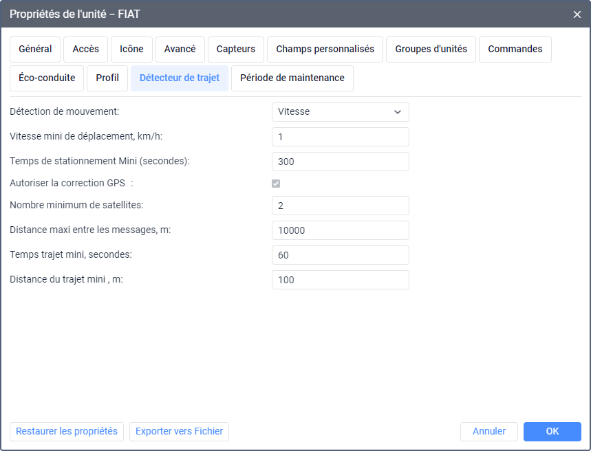 Si 0 est indiqué pour ce paramètre, les arrêts de l'unité ne sont pas détectés, seuls les trajets et le stationnement le sont.