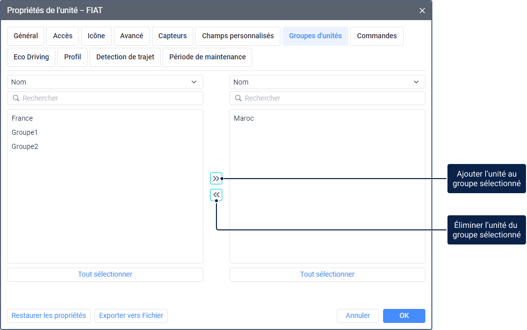 Pour ajouter une unité à un groupe, déplacez-la de la liste de gauche vers celle de droite ; pour l’éliminer, faites à l’envers. Pour transférer, utilisez les icônes