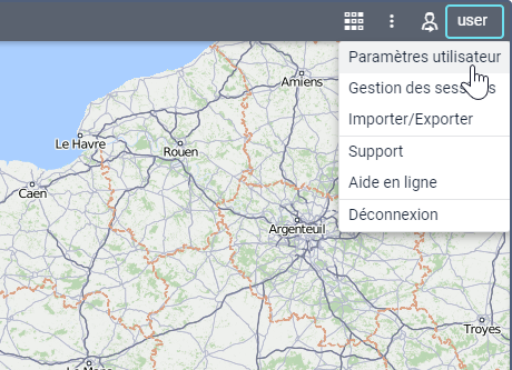 Pour ouvrir les paramètres d’utilisateur, cliquez sur le nom d’utilisateur dans la barre supérieure et sélectionnez l’élément de menu avec le même nom.