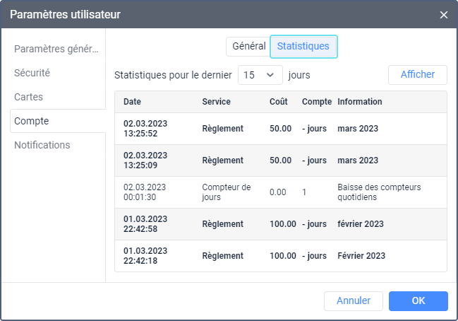 Dans la section Statistiques, vous pouvez obtenir des informations sur le débit des fonds pour les services pendant une période allant jusqu’à 60 jours. Pour ce faire, sélectionnez l’intervalle de temps requis et cliquez sur le bouton Afficher.