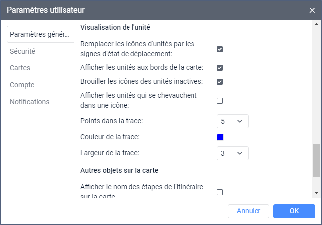 Trace de l’unité | Pour afficher une ligne, correspondant au dernier mouvement de l’unité, lorsqu’elle se déplace, spécifiez les paramètres suivants :