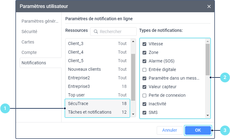 Ici, vous pouvez configurer la réception des notifications en ligne afin qu’elles proviennent uniquement de certaines ressources, et non de toutes celles disponibles. Vous pouvez également sélectionner les types de notification requis pour chaque ressource.