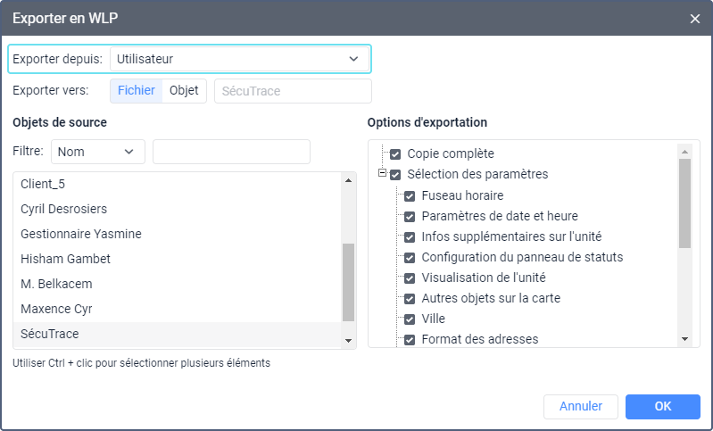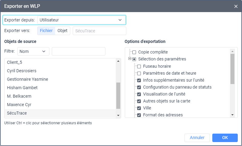 Pour ajouter les paramètres d’un utilisateur depuis un fichier WLP à un autre utilisateur, sélectionnez l’élément Importer depuis WLP dans le menu utilisateur et suivez ce guide.