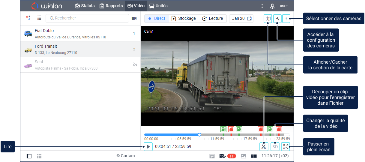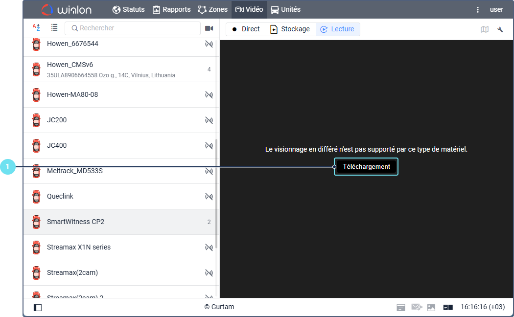 Sur cet onglet, vous pouvez trouver et regarder des vidéos (lectures) de la période écoulée à partir des caméras de l’unité et enregistrer les extraits requis sous forme de fichiers.