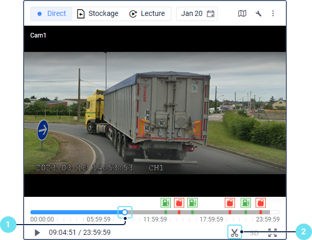 La lecture requise est affichée dans la partie droite de la fenêtre. Pour la regarder, cliquez sur l’icône de lecture ou déplacez le curseur sur la ligne temporelle.