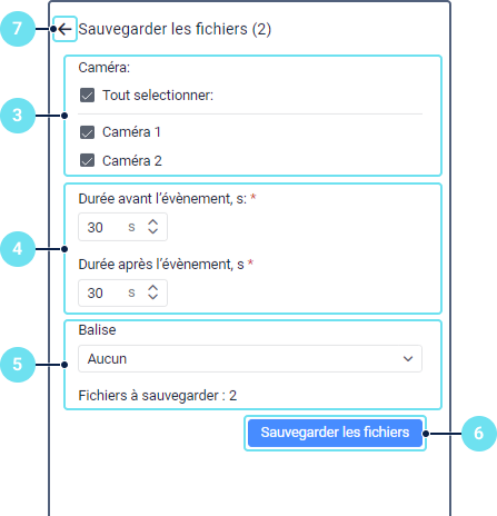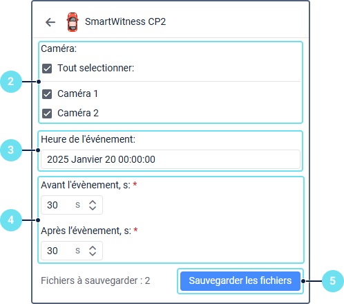 Cliquez sur le bouton Sauvegarder les fichiers. Le bouton est inactif s’il n’y a aucune donnée provenant d’une caméra pour tout l’intervalle que vous souhaitez enregistrer.