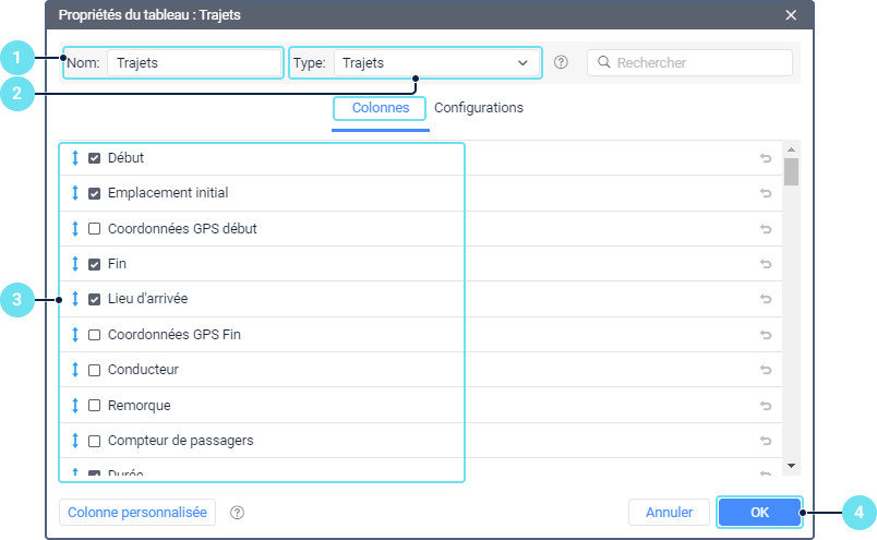 - Cochez les colonnes nécessaires. Dans cet exemple, nous cochons les colonnes suivantes : Début, Emplacement initial, Fin, Lieu d’arrivée, Durée.