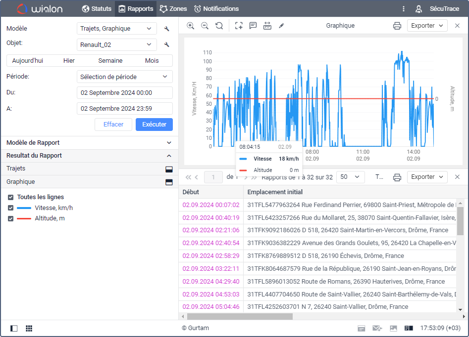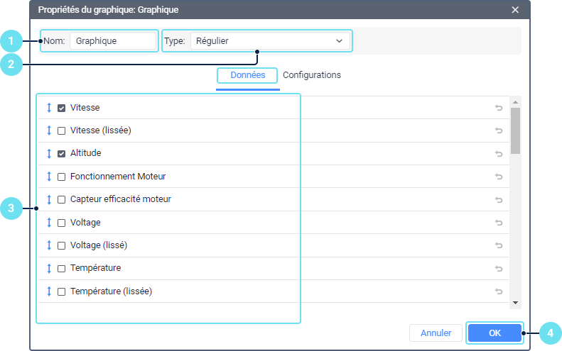 - Vérifiez quel type de données (courbes) doit être affiché dans le graphique. Dans cet exemple, nous marquons les éléments suivants : Vitesse et Altitude.