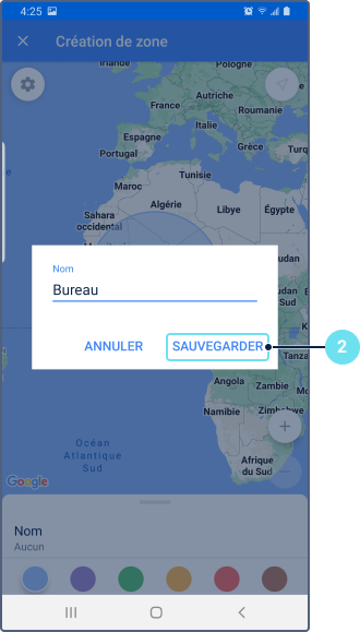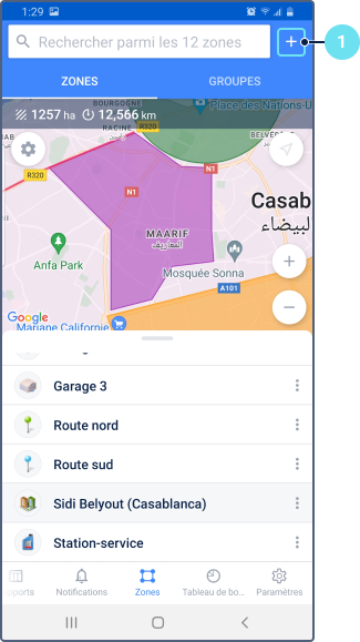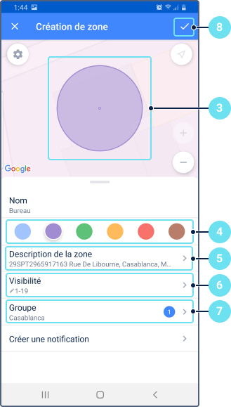 Vous ne pouvez créer que des zones en forme de cercle dans l’application. Pour créer une zone, procédez comme suit :