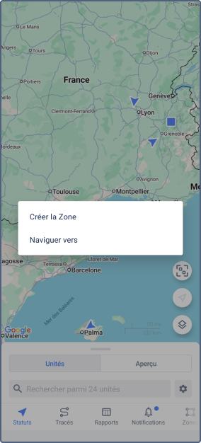 La carte affiche l’emplacement des unités du panneau de statuts, leurs tracés et les événements liés aux unités.