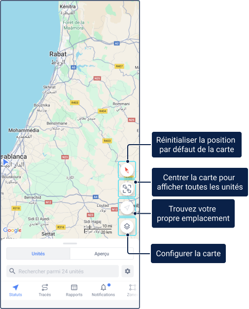 La carte est disponible dans les onglets Statuts, Tracés, Zones et Vidéo. Le processus d’utilisation et de configuration de la carte est pratiquement le même pour tous ces onglets, à l’exception de l’onglet Vidéo. Vous ne pouvez pas interagir avec la carte ni accéder à ses paramètres à partir de l’onglet Vidéo.