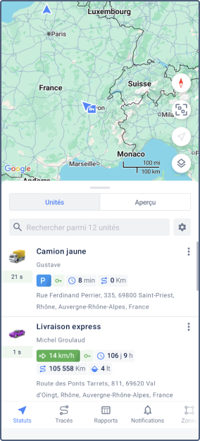 L’onglet Statuts offre une vue d’ensemble des données en temps réel et historiques du parc automobile.