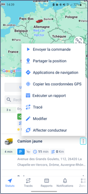 Depuis le menu de l’unité, vous pouvez effectuer des actions telles que l’envoi de commandes, la génération de rapports, le partage de l’emplacement, la modification du nom et de l’icône de l’unité, l’affectation de conducteurs, etc.