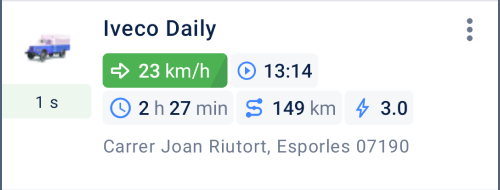 Dans l’onglet Statuts, les dernières données sur les unités, telles que la vitesse, la durée du trajet, le niveau de carburant, les valeurs des capteurs et l’adresse, sont affichées dans la section de l’unité. Elles sont disponibles dans le panneau de statuts de l’unité et les informations détaillées de l’unité.