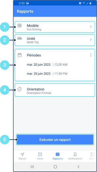 Les sélections de modèle, d’élément et d’orientation de page sont enregistrées jusqu’à la prochaine exécution du rapport.