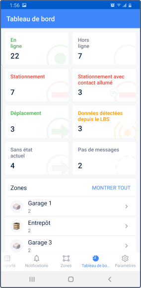 Zones | Ce bloc contient jusqu’à trois zones avec le plus grand nombre d’unités à l’intérieur. Pour ouvrir la liste complète des zones, appuyez sur Tout afficher. |