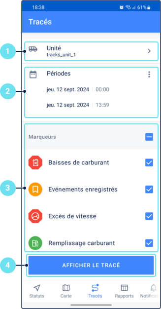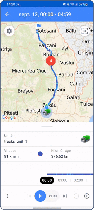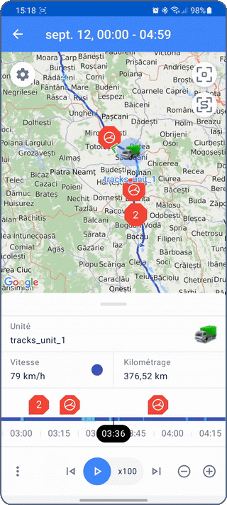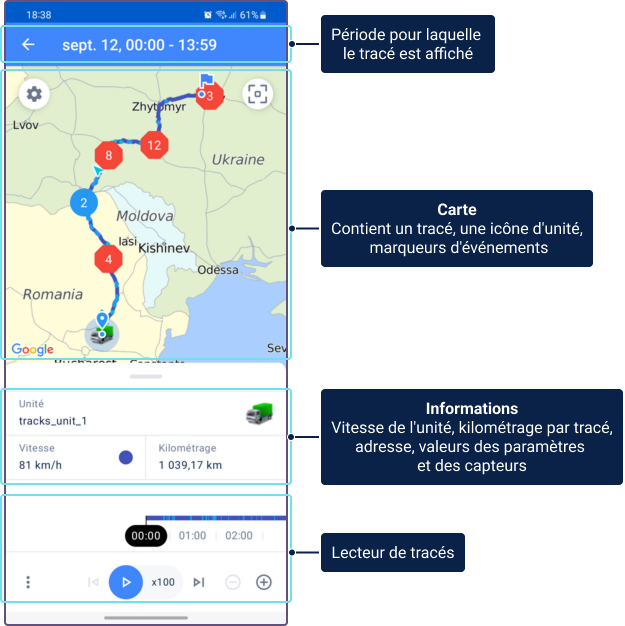 - une carte montrant le tracé, l’icône de l’unité, les marqueurs de début et de fin de tracé et les marqueurs d’événement ;