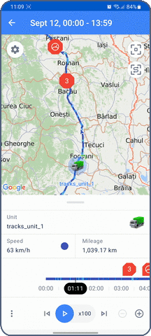 Pendant la lecture, l’icône de l’unité se déplace le long du tracé. Les valeurs des capteurs, les paramètres, la vitesse et l’adresse de l’unité changent dans le bloc d’information situé sous la carte.