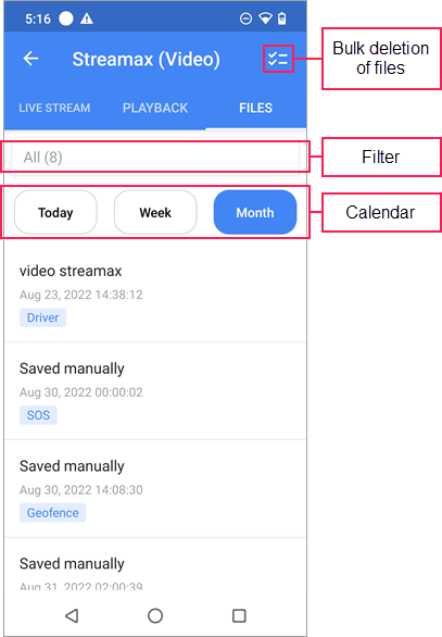 Pour voir les fichiers d’une date précise, sélectionnez-la dans le calendrier. En plus des dates, vous pouvez sélectionner les intervalles Semaine ou Mois pour afficher tous les fichiers enregistrés pour la dernière semaine ou le dernier mois, respectivement.