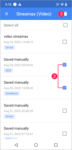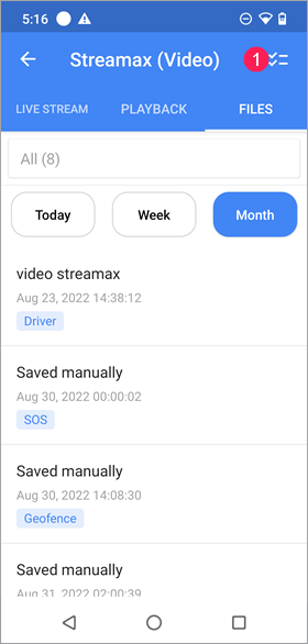 La liste contient tous les fichiers enregistrés de l’unité. Si un fichier a été enregistré au moyen d’une notification, son nom est le même que celui de la notification. Si les fichiers ont été enregistrés manuellement, ils sont nommés Sauvegardé manuellement. Les fichiers sont triés par date et heure de l’événement. La balise du type d’événement s’affiche sous la date et l’heure, si elles sont spécifiées.