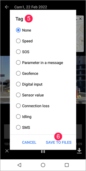 Vous pouvez enregistrer le fragment de lecture requis sous forme de fichier qui sera ensuite disponible dans l’onglet Fichiers. Les fichiers enregistrés sont également disponibles dans la version web de Wialon sur l’onglet du même nom, dans les messages et dans les rapports.