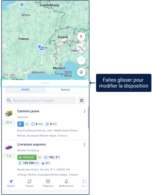 L’onglet Statuts offre une vue d’ensemble des données en temps réel et historiques du parc automobile.