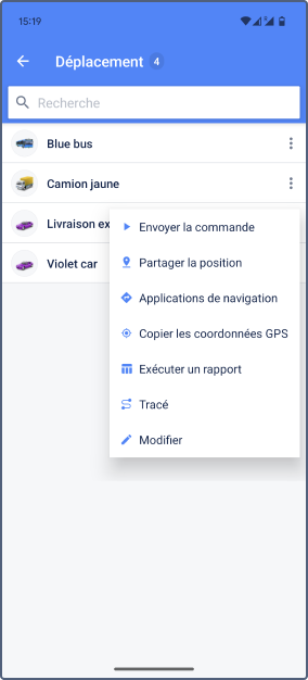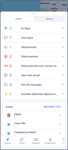 Les données récapitulatives sont organisées en catégories, chacune affichant un certain nombre d’unités correspondant à un statut spécifique. Pour afficher les unités, appuyez sur la catégorie. À partir de la liste des unités, vous pouvez accéder aux informations détaillées et à l’historique de l’unité ou ouvrir le menu de l’unité.