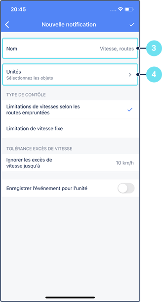 Vous pouvez créer quatre types de modèles de notification dans l’application : Vitesse, Paramètre dans un message, Zone, Alarme (SOS). Pour créer un modèle de notification, suivez les étapes ci-dessous :