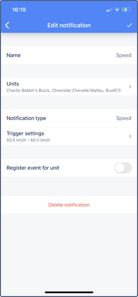 Pour modifier ou supprimer un modèle de notification, appuyez sur sa ligne dans la liste, effectuez les modifications requises ou appuyez sur Supprimer la notification, respectivement, et confirmez l’action.