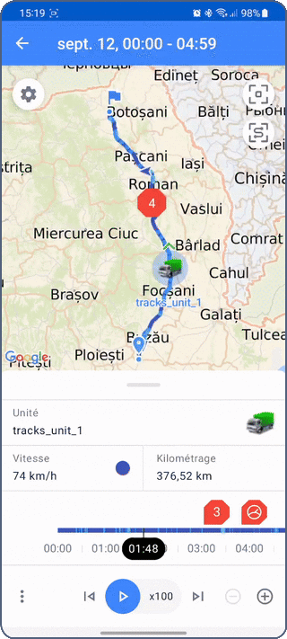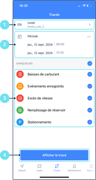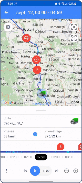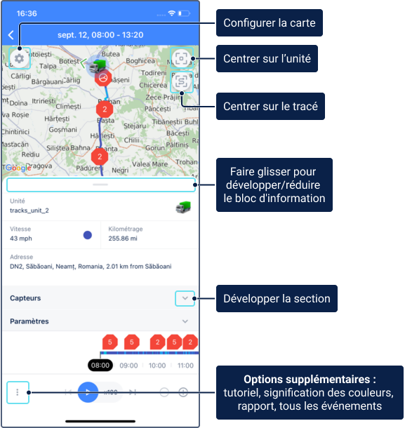 - une carte montrant le tracé, l’icône de l’unité, les marqueurs de début et de fin de tracé et les marqueurs d’événement ;