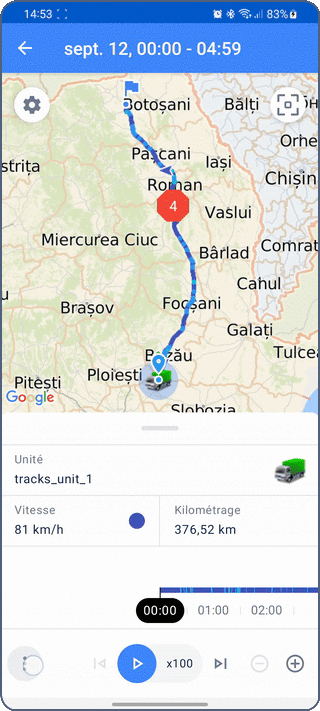Pendant la lecture, l’icône de l’unité se déplace le long du tracé. Les valeurs des capteurs, les paramètres, la vitesse et l’adresse de l’unité changent dans le bloc d’information situé sous la carte.