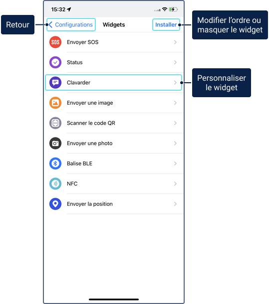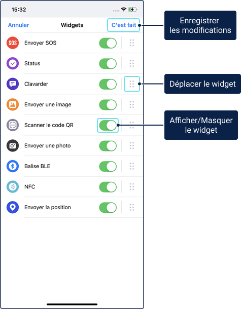 Dans cette section des paramètres, vous pouvez modifier la taille et l’ordre des widgets, les masquer ou configurer d’autres paramètres.