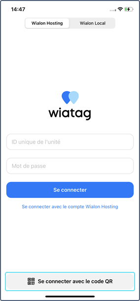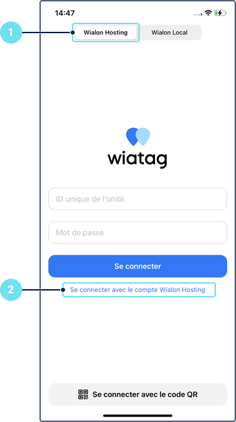 - Appuyez sur Se connecter avec le compte Wialon Hosting ou Se connecter avec le compte Wialon Local respectivement.