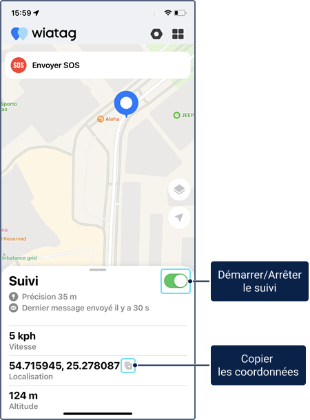 Pour pouvoir désactiver l’envoi de données de position au serveur, l’option Allow the user to turn off tracking in the mobile application doit être activée dans l’application web Configurator.
