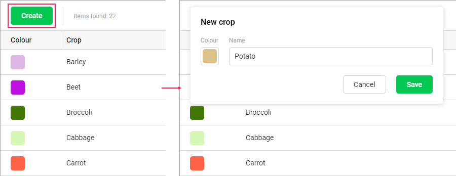 Here you can create the catalogue of crops that are cultivated in the fields.